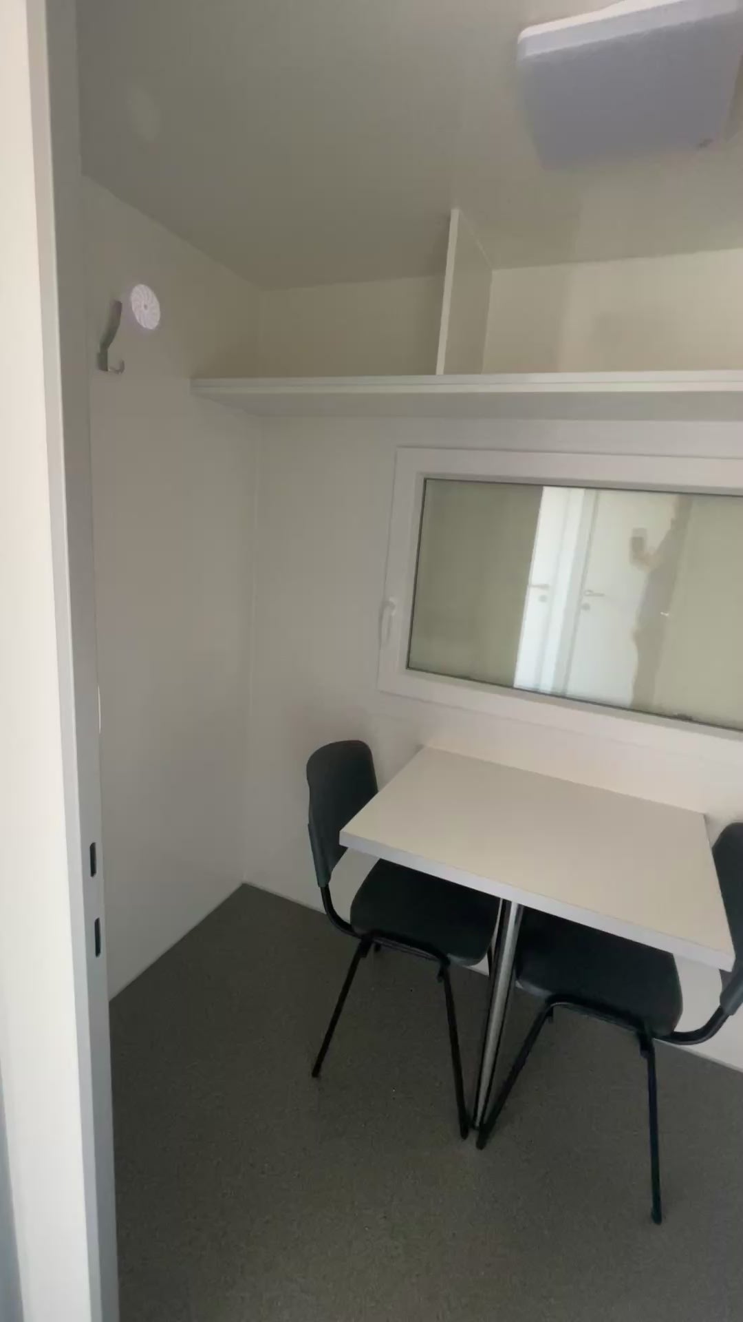 Spise-/siddepladsen til 2 personer er adskilt fra omklædningsrummet med en dør, hvilket giver to zoner: en ren zone og en uren zone. Skifterummet er udstyret med 2 opdelte skabe, så medarbejderne kan holde arbejdstøj og privattøj adskilt. Derudover findes et toilet i den rene zone for øget hygiejne.